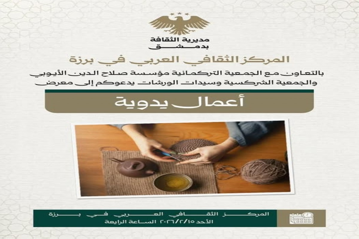 للمزيد من التفاصيل• بمشاركة الجمعية الخيرية الشركسية في سوريا.. افتتح يوم الأحد 15 شباط 2026م بالمركز الثقافي العربي ببرزة وبالتعاون مع الجمعية التركمانية مؤسسة صلاح الدين.. وسيدات الورشات.. معرض (أعمال يدوية) والذي امتد لثلاثة أيام.. • وتواجد في المعرض مجلس أمانة برزة ومدراء بعض المراكز الثقافية وجمهور محب للحرف اليدوية.. وقد عرضت الجمعية الشركسية بعض الأعمال اليدوية من الصوف والقماش والخرز والكروشيه وألعاب الأطفال وغيرها.. • يأتي المعرض انطلاقاً من الرسالة التنموية في دعم الحرفيات وتمكين سيدات المجتمع والأسر لإظهار انتاجهم اليدوي والحرفي للجمهور.. وذلك من خلال التعاون مابين المؤسسات الثقافية والاجتماعية التي تهتم بإحياء العمل الحرفي وإبرازه كجزء أصيل من هوية بلدنا.. • إعداد : المكتب الإعلامي .. سيمازة شرشرة..