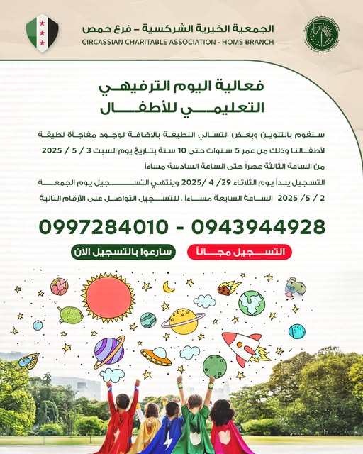 للمزيد من التفاصيلتعلن الجمعية الخيرية الشركسية - فرع حمص - اللجنة الشبابية عن بدء التسجيل لفعالية اليوم الترفيهي التعليمي للأطفال سنقوم بالتلوين وبعض التسالي اللطيفة بالاضافة لوجود مفاجأة لطيفة لأطفالنا وذلك من عمر 5 سنوات حتى 10 سنة بتاريخ يوم السبت 3 / 5 / 2025 من الساعة الثالثة حتى الساعة السادسة التسجيل يبدأ يوم الثلاثاء 29/ 4 /2025وينتهي التسجيل يوم الجمعة 2 / 5/ 2025 الساعة السابعة مساءا