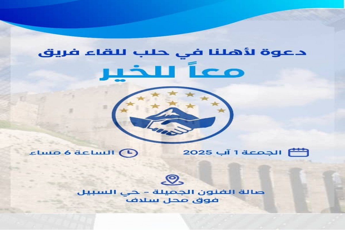 للمزيد من التفاصيلدعوة لأهلنا في حلب للقاء فريق معاً للخير الساعة 6 مساء الجمعة 1 آب 2025 صالة الفنون الجميلة - حي السبيل فوق محل سلاف