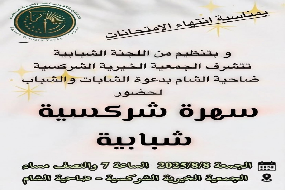 للمزيد من التفاصيلبمناسبة انتهاء الامتحانات وبتنظيم من اللجنة الشبابية تتشرف الجمعية الخيرية الشركسية ضاحية الشام بدعوة الشابات والشباب لحضور سهرة شركسية شبابية الجمعة 2025/8/8 الساعة 7 والنصف مساء الجمعية الخيرية الشركسية - ضاحية الشام