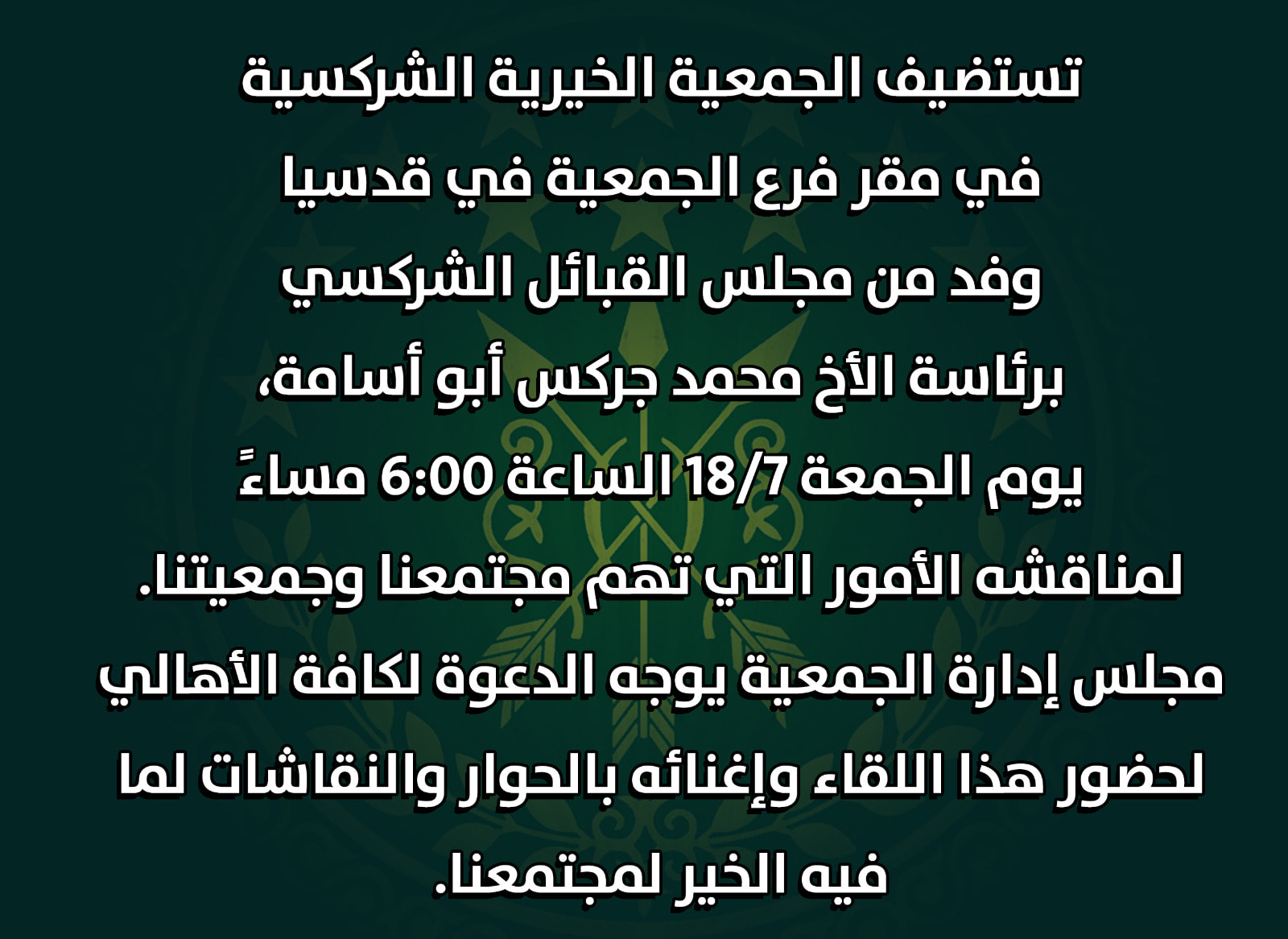 للمزيد من التفاصيلتستضيف الجمعية الخيرية الشركسية في مقر فرع الجمعية في قدسيا وفد من مجلس القبائل الشركسي برئاسة الأخ محمد جركس أبو أسامة، يوم الجمعة 18/7 الساعة 6:00 مساءً لمناقشه الأمور التي تهم مجتمعنا وجمعيتنا. مجلس إدارة الجمعية يوجه الدعوة لكافة الأهالي لحضور هذا اللقاء وإغنائه بالحوار والنقاشات لما فيه الخير لمجتمعنا.