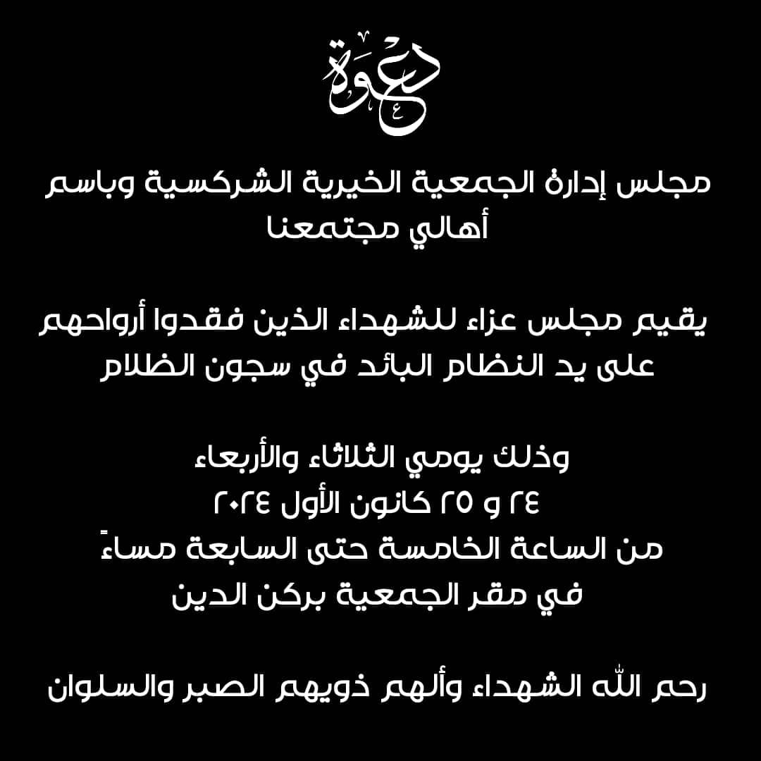 للمزيد من التفاصيلمجلس إدارة الجمعية الخيرية الشركسية وباسم أهالي مجتمعنا يقيم مجلس عزاء للشهداء الذين فقدوا أرواحهم على يد النظام البائد في سجون الظلام وذلك يومي الثلاثاء والأربعاء ٢٤ و ٢٥ كانون الأول ٢٠٢٤ من الساعة الخامسة حتى السابعة مساءً في مقر الجمعية بركن الدين رحم الله الشهداء وألهم ذويهم الصبر والسلوان