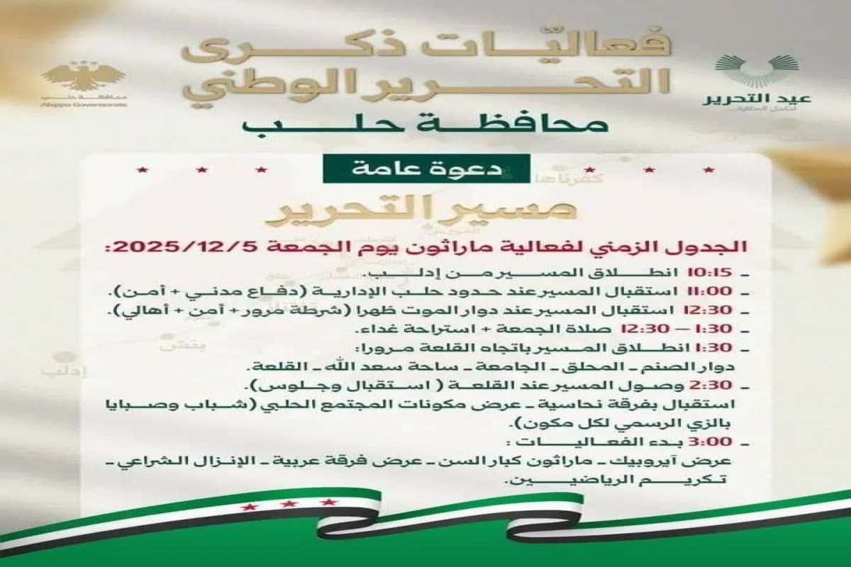 للمزيد من التفاصيلالذكرى الاولى لتحرير سوريا متواجدون امام القلعة . دعوة عامة مسير التحرير الجدول الزمني لفعالية ماراثون يوم الجمعة 2025/12/5: - 10:15 انطلاق المسير من إدلب. - 1:00 استقبال المسير عند حدود حلب الإدارية (دفاع مدني + أمن). - 12:30 استقبال المسير عند دوار الموت ظهرا (شرطة مرور + أمن + أهالي). - 12:30-1:30 صلاة الجمعة + استراحة غداء. - 1:30 انطلاق المسير باتجاه القلعة مرورا: دوار الصنم - المحلق - الجامعة - ساحة سعد الله - القلعة. - 2:30 وصول المسير عند القلعة (استقبال وجلوس). استقبال بفرقة نحاسية -عرض مكونات المجتمع الحلبي (شباب وصبايا بالزي الرسمي لكل مكون). - 3:00 بدء الفعاليات: عرض آيروبيك - ماراثون كبار السن -عرض فرقة عربية - الإنزال الشراعي- تكريم الرياضيين.