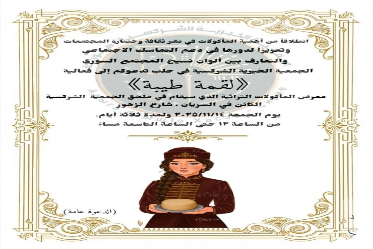 للمزيد من التفاصيلانطلاقاً من أهمية المأكولات في نشر ثقافة وحضارة المجتمعات وتعزيزا لدورها في دعم التماسك الاجتماعي والتعارف بين ألوان نسيج المجتمع السوري الجمعية الخيرية الشركسية في حلب تدعوكم إلى فعالية «لقمة طيبة» معرض المأكولات التراثية الذي سيقام في ملحق الجمعية الشركسية الكائن في السريان، شارع الزهور ( الدعوة عامة ) يوم الجمعة 2025/11/14 ولمدة ثلاثة أيام. من الساعة 12 حتى الساعة التاسعة مساء