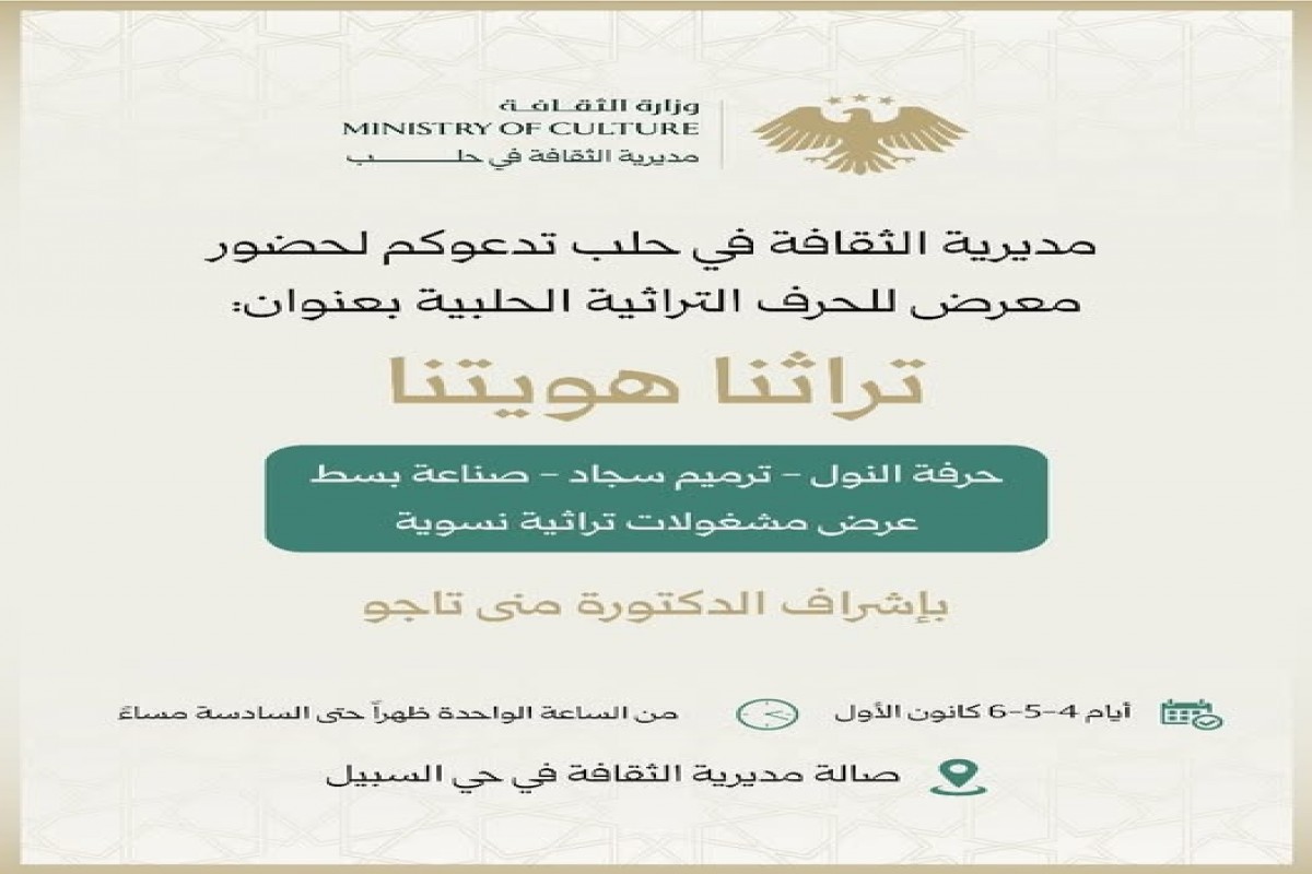 للمزيد من التفاصيلبمناسبة الذكرى الاولى لتحرير حلب تشارك جمعيتنا بمعرض تراثنا هويتنا بمديرية الثقافة بحلب ٤و٥و٦ كانون الاول.