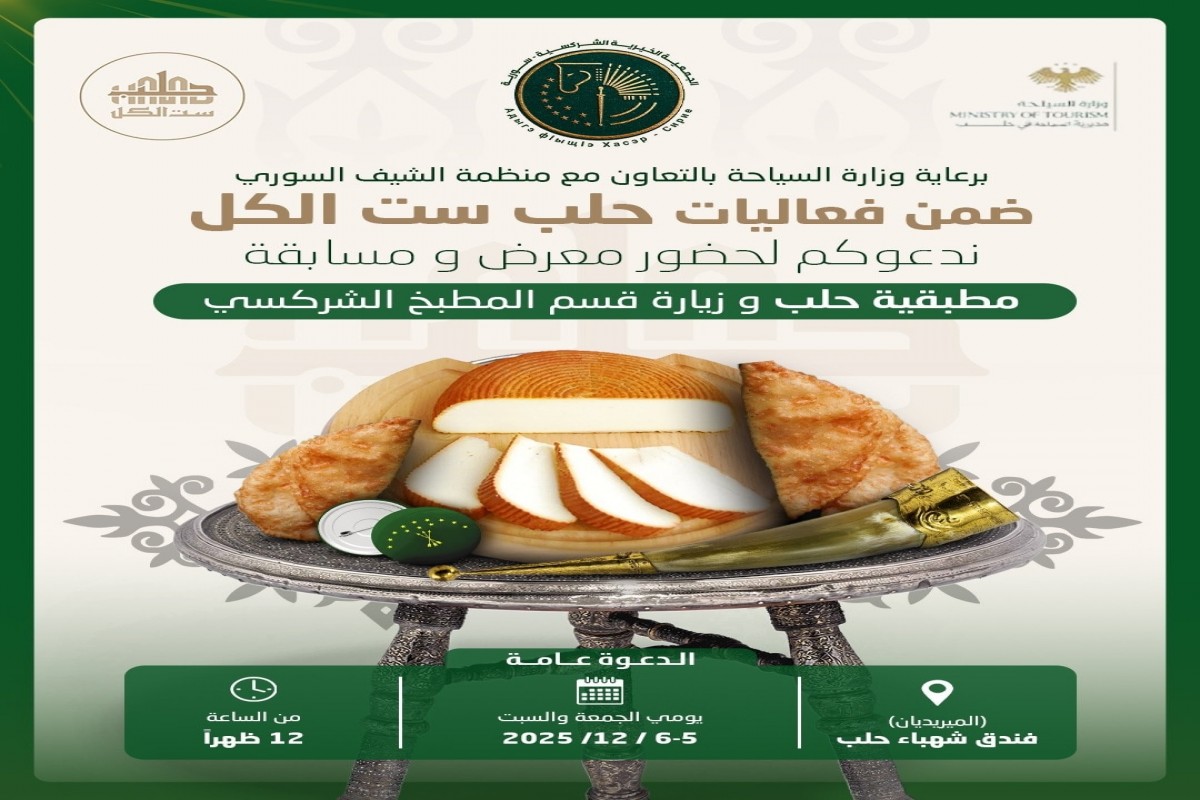 برعاية وزارة السياحة بالتعاون مع منظمة الشيف السوري ضمن فعاليات حلب ست الكل ندعوكم لحضور معرض و مسابقة مطبقية حلب وزيارة قسم المطبخ الشركسي الدعوة عامة (الميريديان) فندق شهباء حلب يومي الجمعة والسبت 2025 /12/ 6-5 من الساعة 12 ظهراً